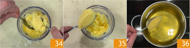 En un cazo, caliente el aceite de semillas a 170°. Ayúdese con 2 cucharas 34 para formar quenelles 35, luego sumérjalas en el aceite caliente 36 y fríalas hasta que estén doradas; tardará unos 4-5 minutos.