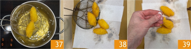 Escurra las quenelles fritas 37 y transfiéralas a papel absorbente 38, luego sazónelas al gusto 39.