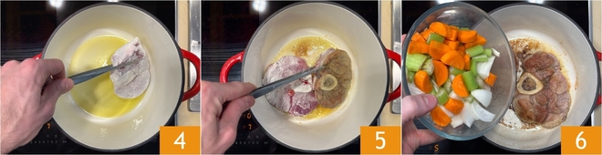 Coloque los osobucos en una cacerola con un poco de aceite caliente (nosotros hemos utilizado una cazuela adecuada para cocinar en el horno, alternativamente puede transferirlos posteriormente a una bandeja) 4 y dórelos a fuego medio durante 3 minutos por cada lado 5. Cuando estén bien dorados, añada las verduras 6.