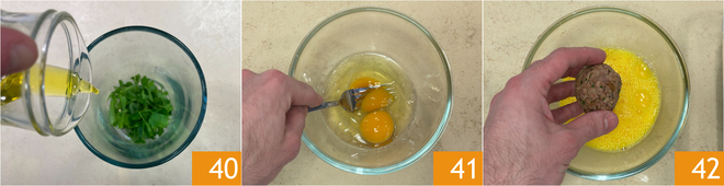 Para el aceite de perejil, deje en infusión el perejil picado en el aceite de oliva virgen extra durante al menos 5 minutos 40. Mientras tanto, dedíquese al empanado y fritura de las albóndigas: caliente el aceite de semillas hasta la temperatura de 170°. Bata los huevos en un bol aparte 41 y pase las albóndigas en el huevo batido 41.