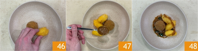 Están listos para emplatar: en cada plato disponga una croqueta de osobuco y 3 quenelles de polenta 46. Rocíe con la salsa de los osobucos restante 47 y complete con unas gotas de aceite de perejil. ¡Sirva de inmediato sus croquetas de osobuco 48!