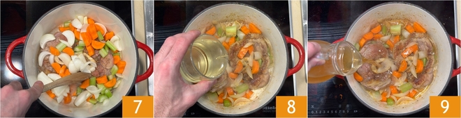 Continúe cocinando a fuego medio durante otros 5 minutos 7, luego desglase con el vino blanco 8 y deje que se evapore completamente. En este punto, agregue el caldo caliente 9.