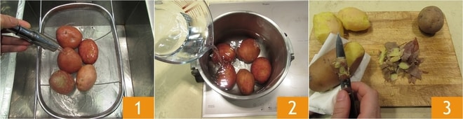 Para preparar las croquetas de patata lava las patatas bajo agua corriente 1 y ponlas a cocer 2 con toda la piel en agua con sal: para obtener una cocción uniforme, utiliza patatas lo más iguales posible en tamaño. Una vez cocidas, (para patatas de tamaño mediano, tomará 15-20 minutos en olla a presión y alrededor de 40 cociéndolas tradicionalmente) déjalas enfriar un poco (solo lo necesario para poder manejarlas) y luego pélalas 3 pinchándolas con un tenedor y quitando la piel con un cuchillo pequeño.