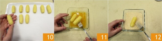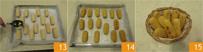 Coloca las croquetas empanadas en una bandeja forrada con papel de horno, rocíalas con un poco de aceite de oliva 13. Coloca las croquetas en el frigorífico durante 15 minutos para que mantengan la forma durante la cocción y cocina las croquetas en el horno estático precalentado a 200° durante 10 minutos y luego continúa la cocción por otros 5 minutos con el grill. Una vez cocidas, saca tus croquetas de patata al horno 14, déjalas enfriar un poco y luego sírvelas bien calientes 15!
