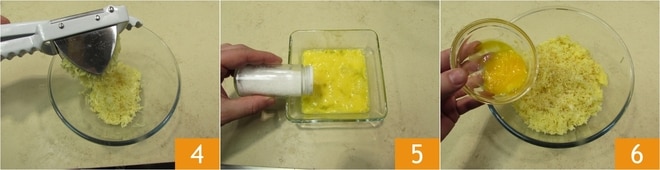 Pásalas por un pasapurés 4 aún calientes y recoge el puré en un bol, aparte bate las yemas con pimienta y sal 5 (ten en cuenta que 30 g de yemas corresponden a las yemas de 2 huevos medianos) luego agrégalas a las patatas 6