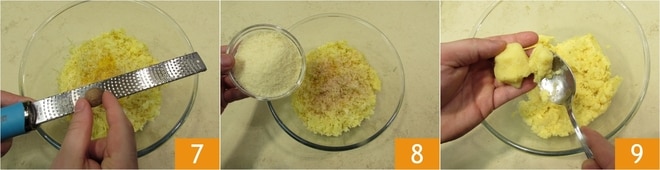 aromatiza con nuez moscada rallada 7 y sazona con el queso rallado 8, mezcla con una cuchara para amalgamar los ingredientes hasta obtener una mezcla suave y seca. Con la ayuda de una cuchara toma una porción de masa de aproximadamente 35 g 9 y forma las croquetas dándoles una forma cilíndrica.