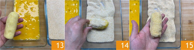 Ahora pasa la croqueta primero por el huevo batido 13 y luego por el pan rallado 14. A medida que estén listas 15, coloca las croquetas en una bandeja.