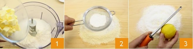 Para preparar la tarta de frutas del bosque empieza con la Pasta quebrada, comenzando con el arenado: en un procesador de alimentos coloca la harina tamizada y la mantequilla recién sacada del frigorífico, cortada en trozos 1. Tritura todo hasta obtener una mezcla con aspecto arenoso y harinoso, luego vierte el arenado obtenido sobre una superficie de trabajo (o en un bol) y añade el azúcar glas tamizado 2; crea una forma de fuente y en el centro coloca la cáscara de limón rallada 3.