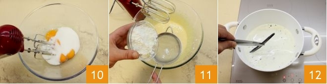 Mientras tanto, coloca las yemas en un bol grande y añade el azúcar 10. Mezcla todo con una batidora eléctrica (o un batidor manual) para obtener una crema homogénea y luego añade la maicena tamizada 11, siempre mezclando para integrarla bien con el resto de la mezcla. Pasados 5 minutos, retira la vaina de vainilla que habías dejado en infusión en la leche y nata 12.