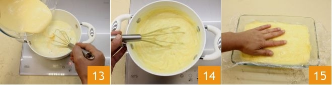 En este punto, añade a la mezcla de huevos batidos con el azúcar y la maicena, mezclando bien con las varillas 13. Vuelve a encender el fuego suave y mezcla continuamente para espesar la mezcla durante un máximo de 4 minutos. Cuando la crema pastelera esté bien espesa 14, apaga el fuego y viértela en un recipiente bajo y amplio, cubriéndola inmediatamente con film transparente al contacto para evitar la formación de una molesta costra 15; déjala enfriar primero a temperatura ambiente y luego en el frigorífico durante al menos una hora.