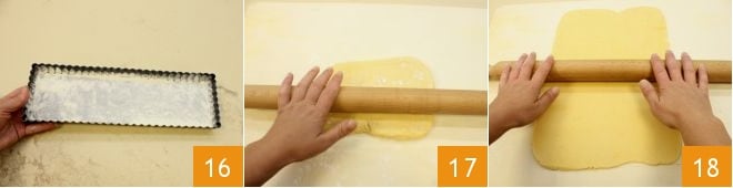 Mientras tanto, unta con mantequilla y enharina el molde para tarta de 35x11 cm (alternativamente, puedes usar un molde redondo de aproximadamente 20 cm de diámetro) 16; pasados 30 minutos, saca la masa quebrada del frigorífico y retira el film. Transfiere el bloque a una superficie de trabajo ligeramente enharinada 17, luego con un rodillo extiende la masa quebrada con un grosor de aproximadamente 1 cm y que mida aproximadamente 35x11 cm 18.