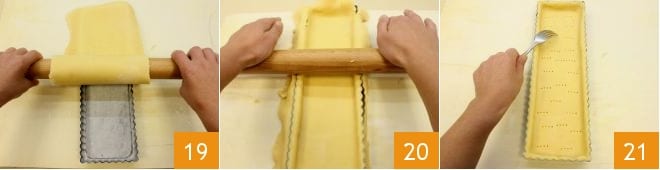 Envuelve la base que has obtenido en el rodillo y desenrólala sobre el molde rectangular 19; una vez bien extendida, siempre con el rodillo, presiona los bordes del molde para eliminar las partes laterales sobrantes 20, finalmente con los dientes de un tenedor pincha la superficie sin atravesar la masa 21.