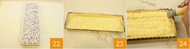 Procede ahora a la Cómo hacer la cocción a ciegas: cubre la base con papel de horno y llena el interior del molde con esferas de porcelana (o con legumbres secas) 22 y hornea en horno estático precalentado a 180° durante unos 20 minutos (o en horno ventilado a 160° durante 15 minutos): la masa que obtendrás deberá cocinarse sin colorearse en exceso. Una vez cocido, saca el molde del horno, retira las esferas (o las legumbres secas) y deja enfriar la base de la tarta. Una vez fría, retira el papel de horno de la masa quebrada 23. Pasado el tiempo necesario de enfriamiento, con una manga pastelera con boquilla estriada llena la base de la tarta con la crema pastelera ya fría 24.