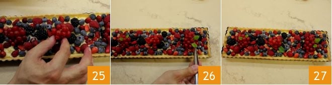 Lava las frutas del bosque bajo agua corriente fresca, luego distribúyelas delicadamente sobre toda la superficie de la tarta de manera homogénea 25. Finalmente, decora la tarta de frutas del bosque añadiendo las hojitas de menta 26 y sirve 27.