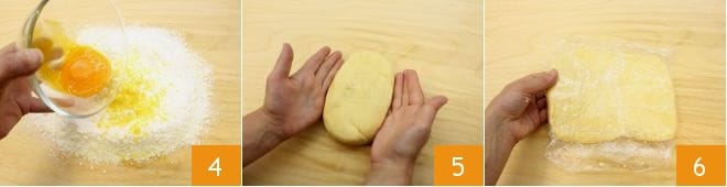 Añade también la yema 4, luego trabaja brevemente la masa, solo el tiempo suficiente para compactarla para que la masa quebrada no se caliente demasiado con el calor de las manos y se mantenga quebradiza 5. Forma un bloque y aplánalo bien; envuélvelo en film transparente 6 y colócalo en el frigorífico al menos 30 minutos para que se endurezca.