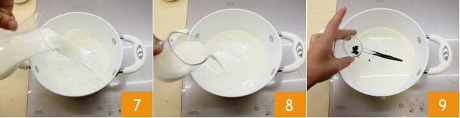 Mientras tanto, prepara la Crema pastelera. Pon al fuego una cacerola grande con la leche 7 y la nata líquida 8; luego toma la vaina de vainilla, incídela con un cuchillo y extrae las semillas rascándola. Añade tanto las semillas como la vaina de vainilla a la mezcla de leche y nata 9 y enciende el fuego a llama baja. Cuando la mezcla haya alcanzado el punto de ebullición, apaga el fuego y deja la vainilla en infusión durante al menos 5 minutos.