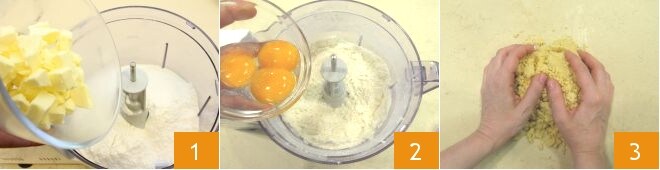 Para preparar la tarta de melocotones y amaretti, comienza con la masa quebrada: coloca en un robot de cocina la harina, el azúcar glas y la mantequilla fría de la nevera, cortada en trozos 1. Enciende la máquina hasta que la mantequilla esté arenosa, luego añade las yemas 2 y espera a que se formen migas mucho más grandes. Vierte la mezcla sobre una superficie de trabajo, añade una pizca de sal y amasa los ingredientes muy rápidamente para no calentarlos 3, hasta compactar todo.