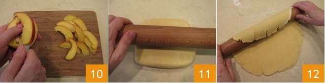 Corta los restantes 400 gramos de melocotones en rodajas 10 de aproximadamente 3-4 mm de grosor, sin pelarlos (pélalos solo si no estás usando nectarinas). Extiende la masa quebrada 11 hasta obtener una hoja de aproximadamente medio centímetro 12.