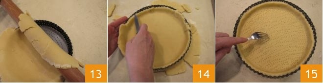 Forra un molde de 24 cm de diámetro 13, elimina la masa quebrada sobrante cortándola con un cuchillo 14 y resérvala. Pincha el fondo de la tarta con los dientes de un tenedor 15,