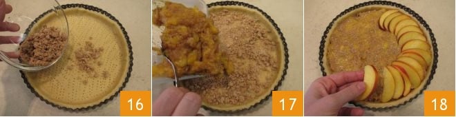 y desmenuza encima 40 gramos de amaretti 16, que además de dar sabor, servirán para absorber los líquidos de la fruta generados por la cocción en el horno. Luego añade la mezcla de melocotones y amaretti 17, extendiéndola uniformemente y coloca en forma de espiral las rodajas de melocotón,