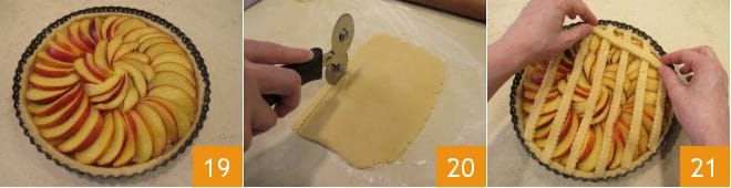 hasta cubrir toda la superficie 19. Extiende la masa quebrada restante y córtala en tiras 20, luego comienza a colocarlas sobre la tarta,