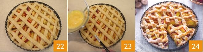 y crúzalas formando rombos 22. Bate un huevo y unta las tiras de masa ayudándote con un pincel 23, luego hornea en horno estático precalentado a 180° durante unos 40 minutos (o en horno ventilado a 160° durante unos 20 minutos). Una vez cocida, retira la tarta y colócala sobre una rejilla. Déjala enfriar y ¡tu tarta de melocotones y amaretti está lista para ser servida 24!