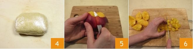 Forma un bloque, envuélvelo en film transparente 4 y déjalo reposar en el frigorífico durante al menos media hora. Mientras tanto, lava y pela 800 gramos de melocotones 5 y córtalos en trozos 6.