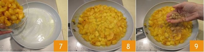 En una sartén, derrite 30 gramos de mantequilla, luego añade los melocotones cortados en trozos 7; tan pronto como comiencen a ablandarse 8, añade en la sartén 60 gramos de amaretti desmenuzados 9. Cuando la mezcla se haya vuelto bastante cremosa y seca, apaga el fuego y deja enfriar.