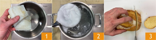 Para preparar los crostini con bacalao mantecado, primero poned el bacalao en una olla con agua fría 1 y llevad a ebullición. Cocinad durante 15-20 minutos o hasta que el bacalao esté tierno, eliminando la espuma que se formará en la superficie 2. Mientras tanto, cortad el pan en rebanadas 3.