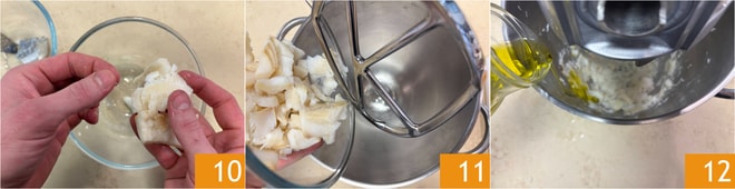 Quitad también las espinas 10 y desmenuzadlo con las manos. Trasladad el bacalao a un bol de batidora con pala 11, poned en marcha y añadid el aceite de oliva en hilo 12; debéis obtener una consistencia cremosa. Si resulta demasiado seco, podéis añadir un poco de agua de cocción del bacalao poco a poco hasta obtener la consistencia deseada.