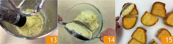 Ajustad de sal y pimienta 13. Formad quenelles con la ayuda de 2 cucharas 14 y colocadlas sobre los crostini 15.