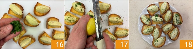 Adornad con perejil picado 16 y cáscara de limón rallada 17. ¡Tus crostini con bacalao mantecado están listos para ser disfrutados 18!