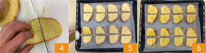 Dividid las rebanadas por la mitad 4, colocadlas en una bandeja forrada con papel de horno y rociad con aceite 5. Hornead en horno ventilado a 200° durante 5-7 minutos 6.