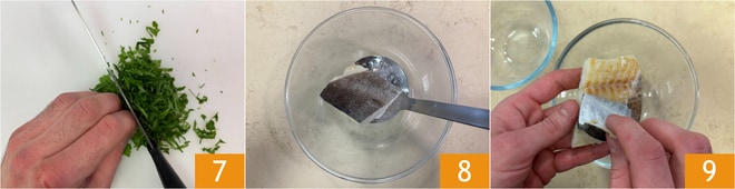 Picad el perejil finamente 7. Escurrid el bacalao 8 y dejad templar, luego retirad la piel 9.