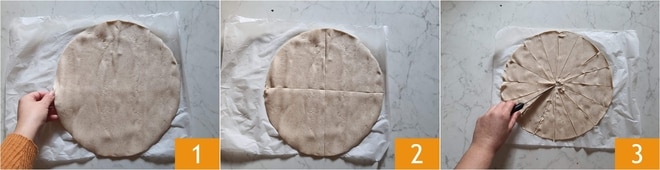Para preparar los cruasanes de hojaldre al salmón, primero desenrolla la masa de hojaldre sobre una superficie 1. Utilizando un cuchillo afilado, divídelo primero en 4 triángulos 2, luego de cada uno saca otros 4 de manera que obtengas 16 3.