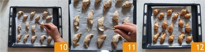 Decora con semillas de sésamo 10 y semillas de amapola 11. Hornea en horno ventilado precalentado a 190° durante 15 minutos. Cuando estén bien dorados, saca los cruasanes del horno 12 y déjalos enfriar antes de servirlos.