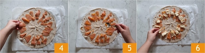 Rellena cada triángulo con un trozo de salmón 4, un poco de cáscara de naranja rallada 5 y un trozo de queso brie 6.