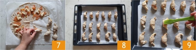 Comenzando desde la base, enrolla cada triángulo sobre sí mismo para darle la forma de un cruasán 7. A medida que los hagas, pasa los cruasanes a una bandeja con papel de horno, separándolos ligeramente 8. Bate la yema junto con la leche, luego úsalo para pincelar cada cruasán 9.