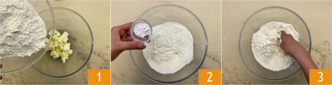 Para preparar el crumble de mermelada, coloca en un bol la mantequilla fría en cubos, la harina 1 y la levadura 2, comienza a desmenuzar el compuesto con las manos 3.