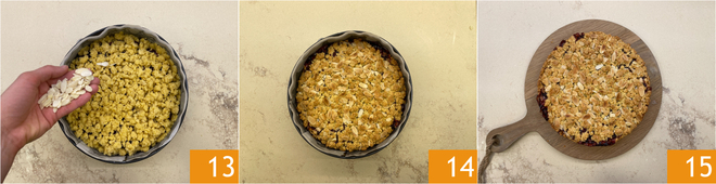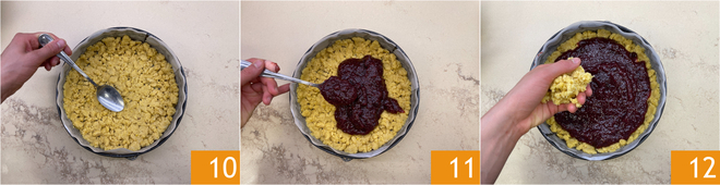 Compacta el fondo con las manos o el dorso de una cuchara 10 y forma también el borde. Distribuye la confitura 11 y cubre con las migas restantes 12.