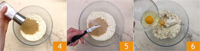 Agrega el azúcar, una pizca de sal 4 y las semillas de vainilla 5. Por último, incorpora los huevos 6.