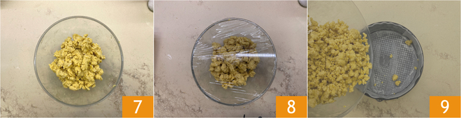 Sigue desmenuzando la mezcla para formar migas gruesas 7, cubre con film transparente y pon en el frigorífico durante 1 hora 8. Forra con papel de horno un molde desmontable de 22 cm de diámetro, vierte 2/3 de la masa 9.