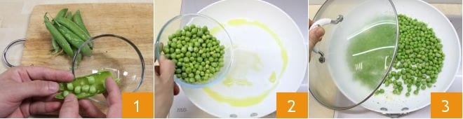 Para preparar el crumble de verduras desgrana los guisantes 1, luego en una sartén sofríe un diente de ajo con un chorrito de aceite y añade los guisantes desgranados 2, cubre con la tapa 3 y cocina durante unos 10 minutos, si es necesario añade un cucharón de Caldo de verduras para que no se sequen demasiado.