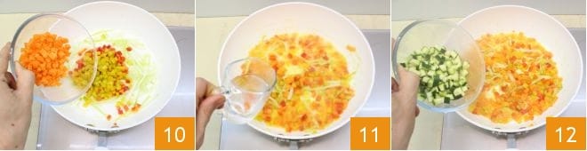 y amarillos, las zanahorias 10 cocina durante 5-6 minutos, luego vierte el agua caliente 11 o el caldo vegetal y añade los calabacines en cubitos 12