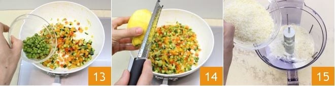 y las dos cucharadas de guisantes 13 que has reservado. Continua durante otros 5 minutos y luego ajusta de sal y pimienta y aromatiza con la ralladura de limón 14 y el romero. Ahora encárgate del crumble: pon en la batidora las harinas, el queso parmesano rallado 15