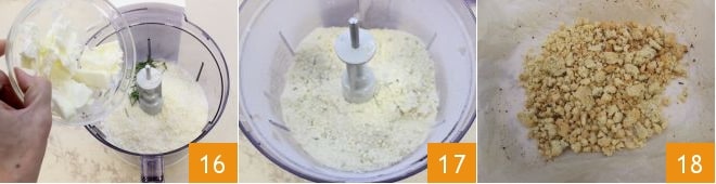 la mantequilla fría en trozos 16, el romero y una pizca de sal, acciona las cuchillas por unos instantes el tiempo necesario para crear una masa arenosa 17, distribúyela uniformemente sobre una bandeja revestida con papel de horno y cocina en horno estático a 160° durante 15 minutos (o en horno ventilado a 140° durante 10 minutos). Una vez cocido, saca el crumble y déjalo enfriar 18.