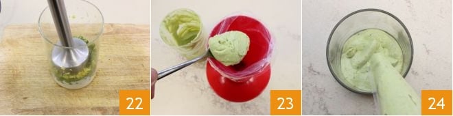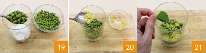 Para terminar, prepara la crema de guisantes: pon el yogur griego en un recipiente alto, añade los guisantes 19 (si no lo prefieres elimina antes el diente de ajo) sazona con la ralladura de limón 20 y las hojas de menta 21