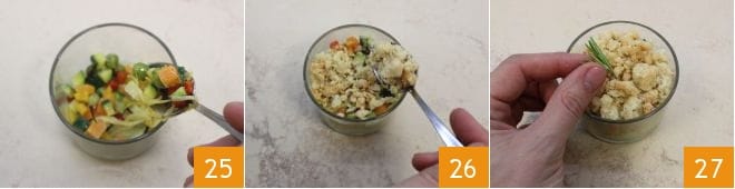 Luego cubre con una segunda capa de verduras 25 y termina cubriendo la superficie con el crumble salado 26. El crumble de verduras está listo, adórnalo con una ramita de romero 27, colócalo en el frigorífico hasta el momento de servirlo y disfrútalo a temperatura ambiente.