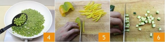Salpimienta al gusto y retira un par de cucharadas de guisantes para añadir a las otras verduras 4. Corta los pimientos por la mitad y luego en tiras finas 5, corta los extremos de los calabacines y córtalos en cubitos pequeños 6,