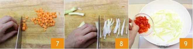 haz lo mismo con las zanahorias 7 y luego corta los cebolletas en tiras finas 8. En este punto, sofríe la cebolleta en una sartén con un chorrito de aceite, luego añade los pimientos rojos 9